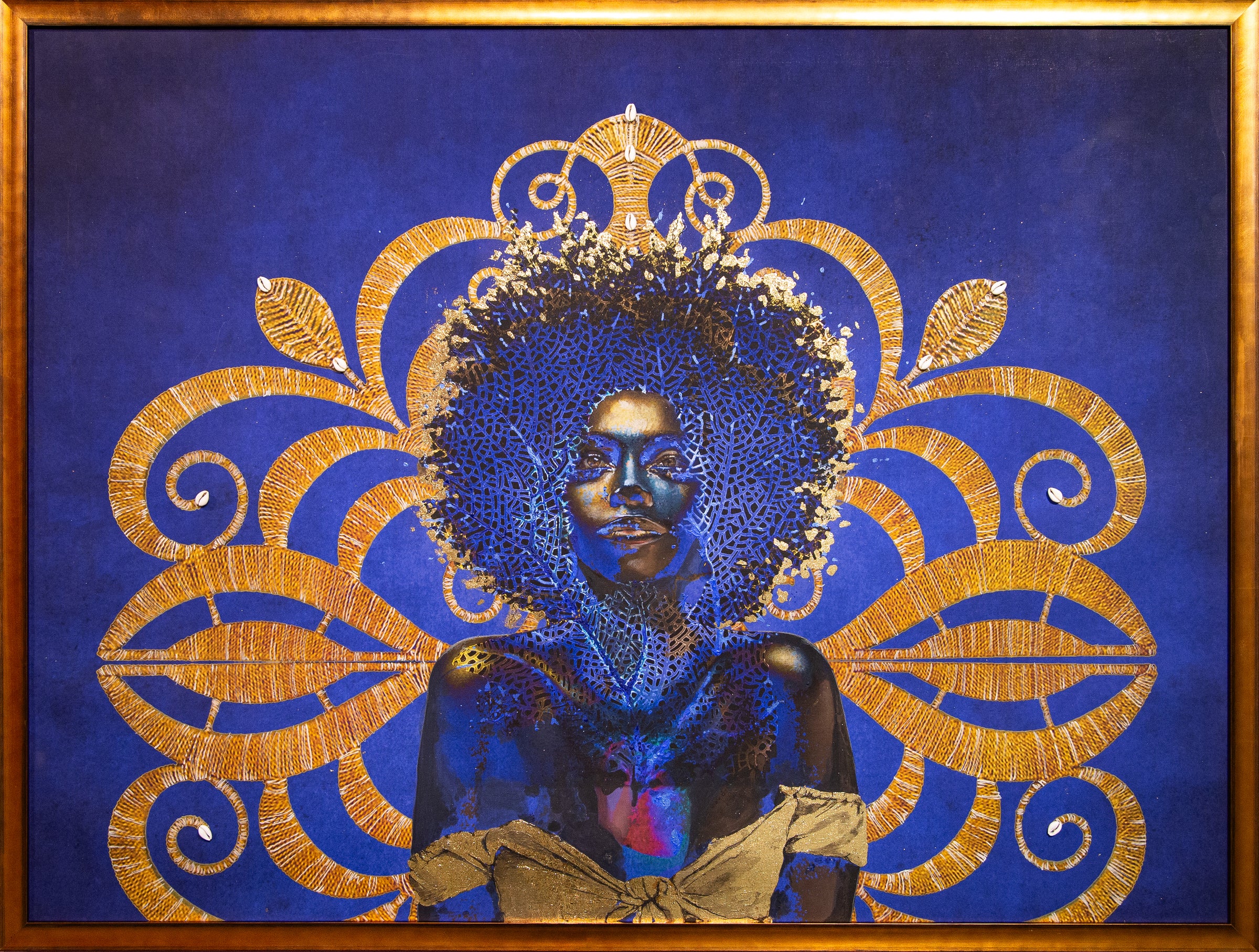 Hand-Embellished Archival Print on Matte Canvas with Gold Leaf, Acrylic, India Ink, Pencil and Cowrie Shells over Digital Art and Photography (Ed. 1/5) (Framed)