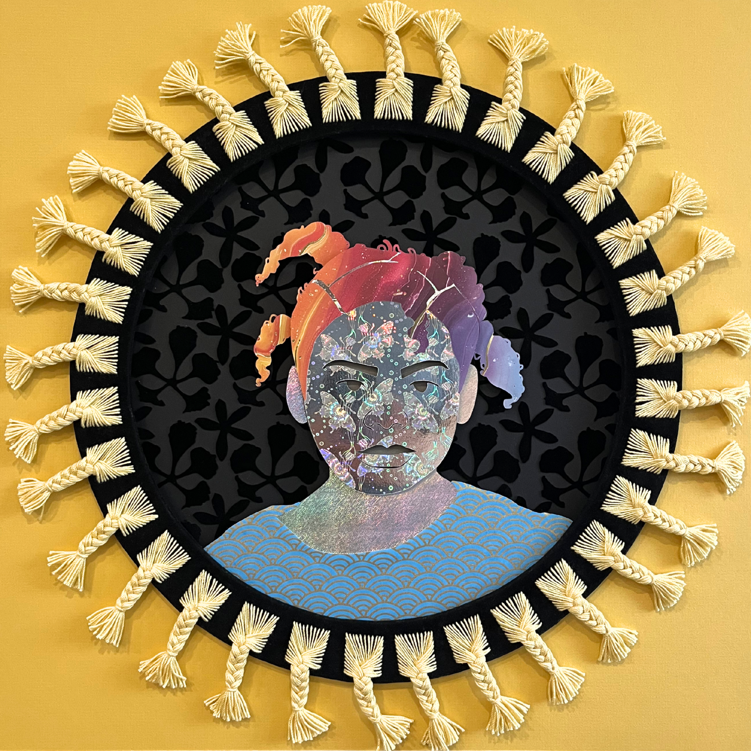 Decorative Paper Collage, Embroidery Thread, Velvet Flock (Framed)